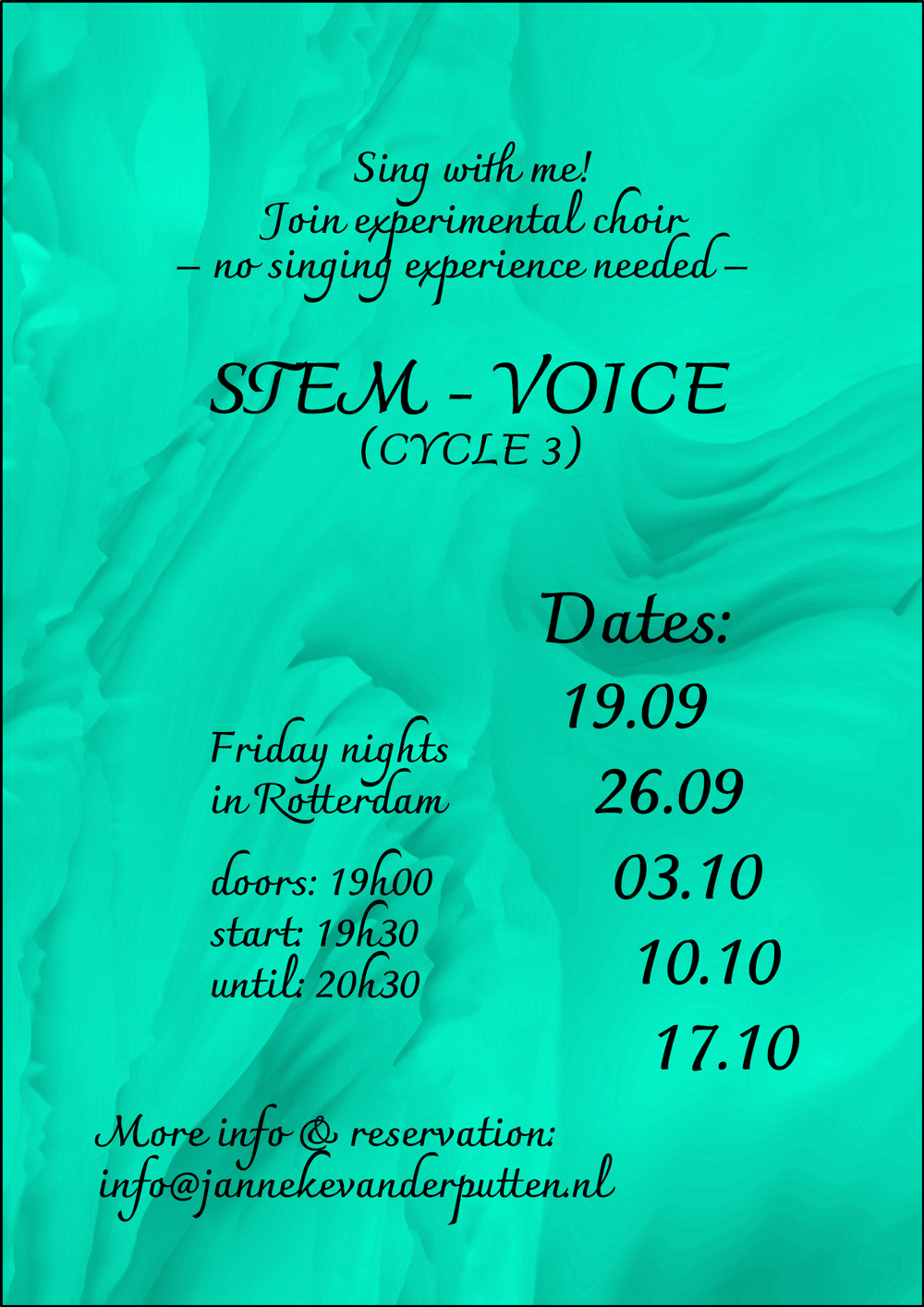 Open call for persons interested to participate in 'STEM - VOICE (cycle 3)': a laboratory in choir format to explore the voice through situated connection, echo-location, and spatial phenomena. The laboratory consists of a cycle of five sessions of 1-1,5 hour duration each, and will include singing technique training, choir singing, movement and body practice. No prior singing experience is needed.